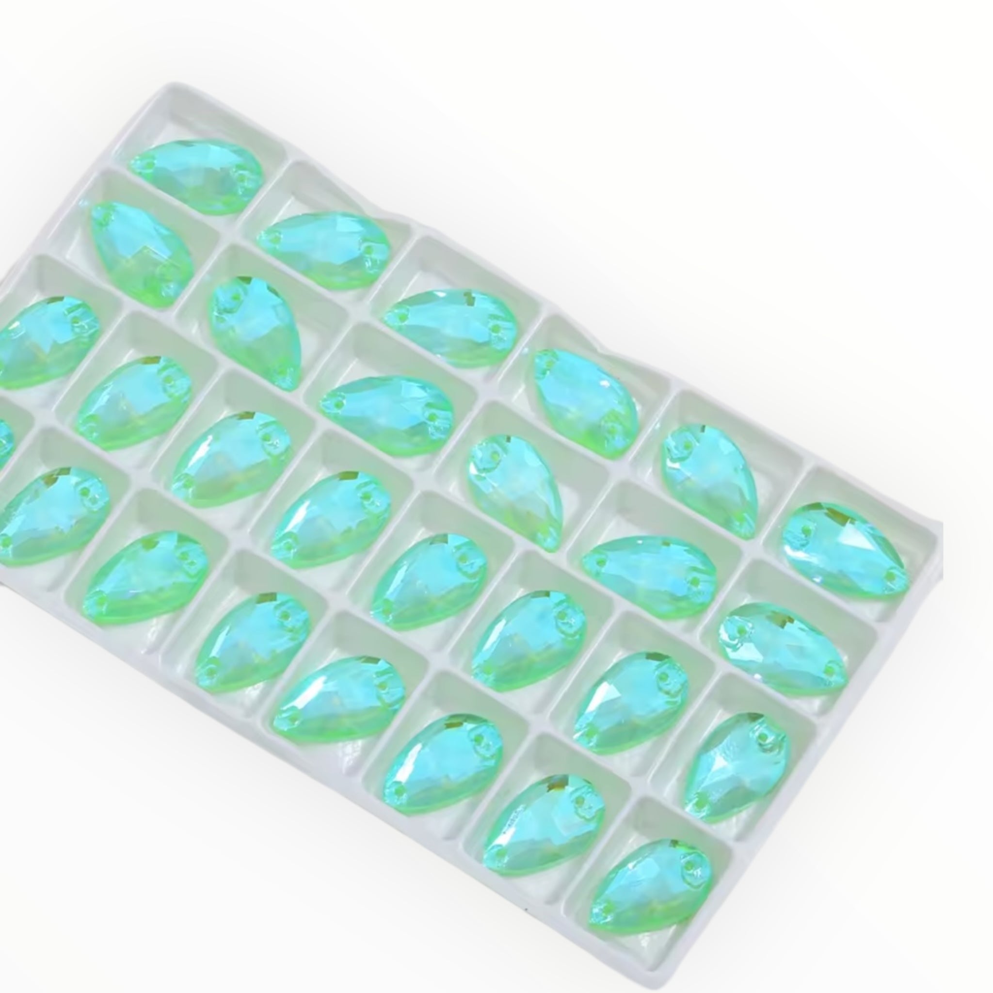 These stunning 17x28mm Light Peridot fancy glass crystals are designed to sparkle like crazy! With brilliant faceting and a sleek shape, they make the perfect statement piece for regalia, beadwork, garments, or accessories. Pre-drilled holes make sewing secure and easy.