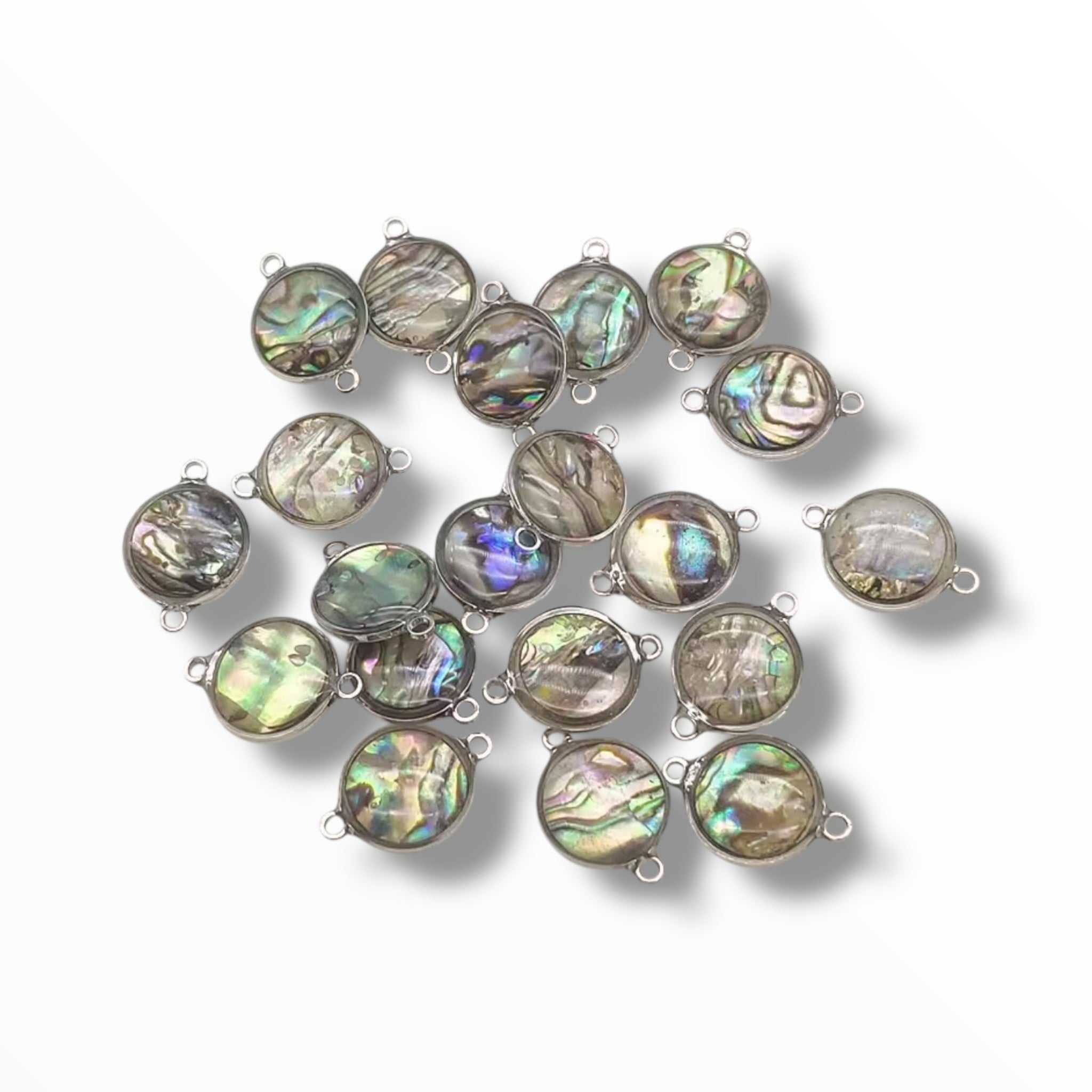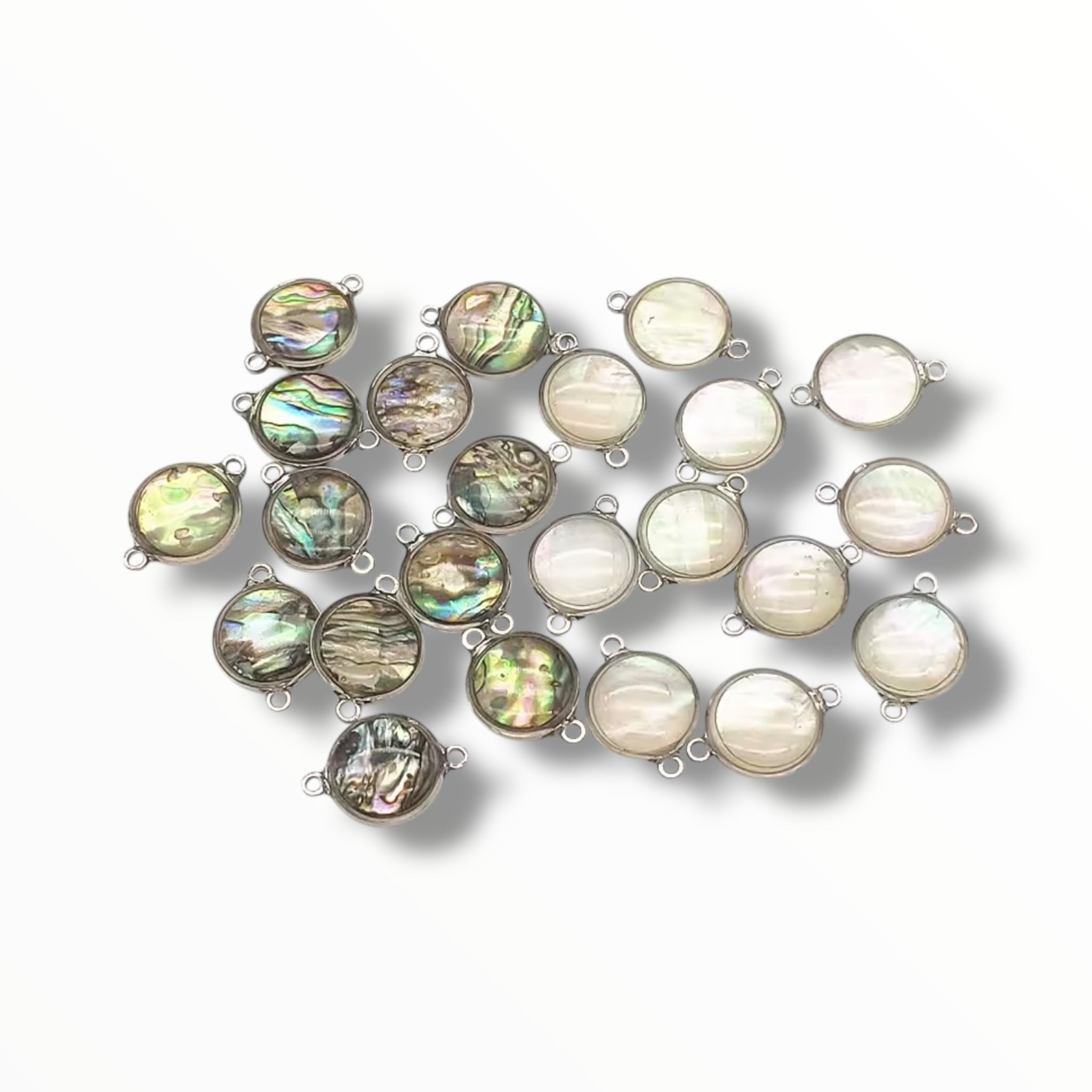 Add a touch of ocean-inspired elegance to your jewelry designs with these Real Shell Round Connectors. Featuring a blend of abalone and white shell inlays, each piece shimmers naturally with iridescent tones. The rhodium finish offers a sleek, modern look that pairs beautifully with both cool and warm color palettes. Perfect for creating necklaces, bracelets, or earrings.