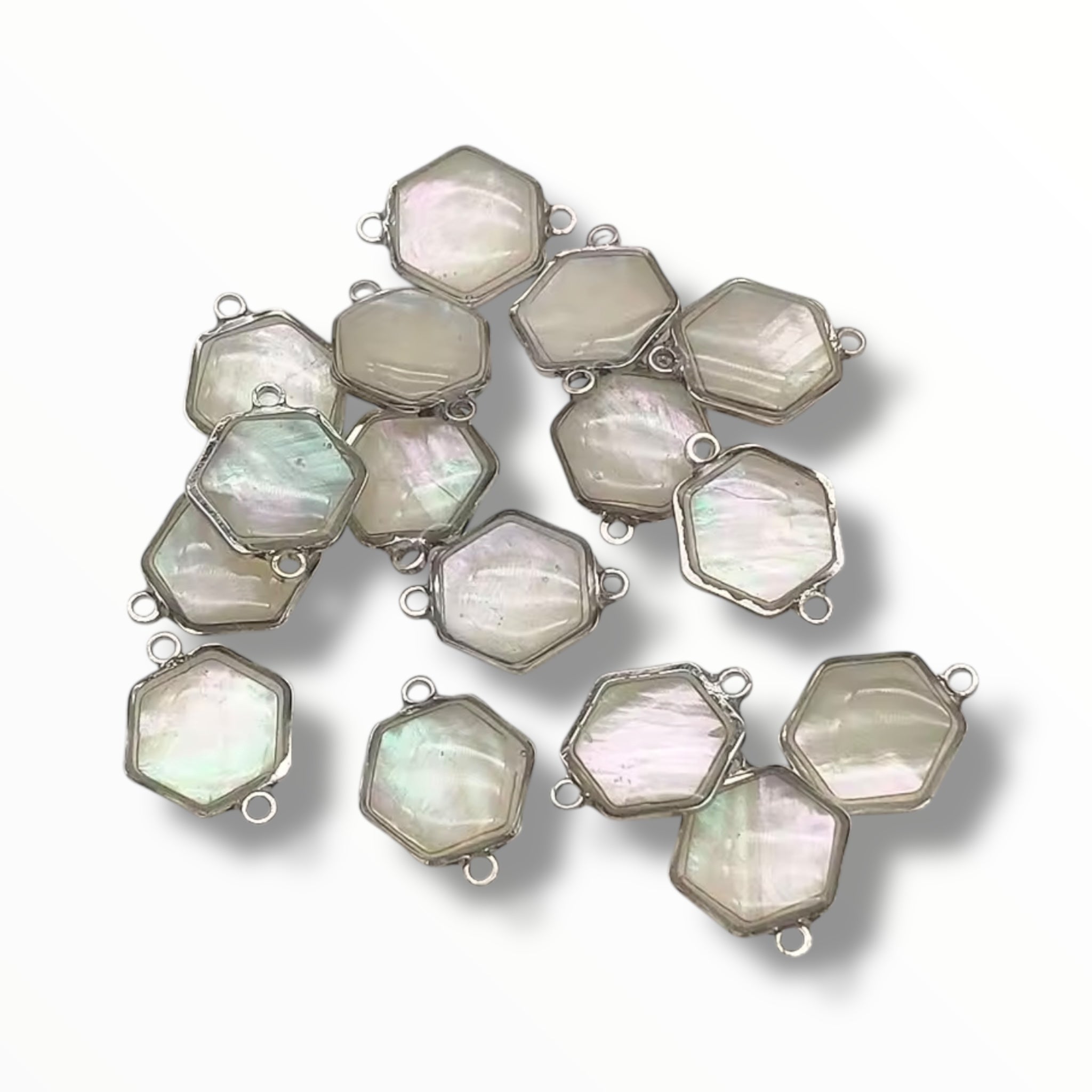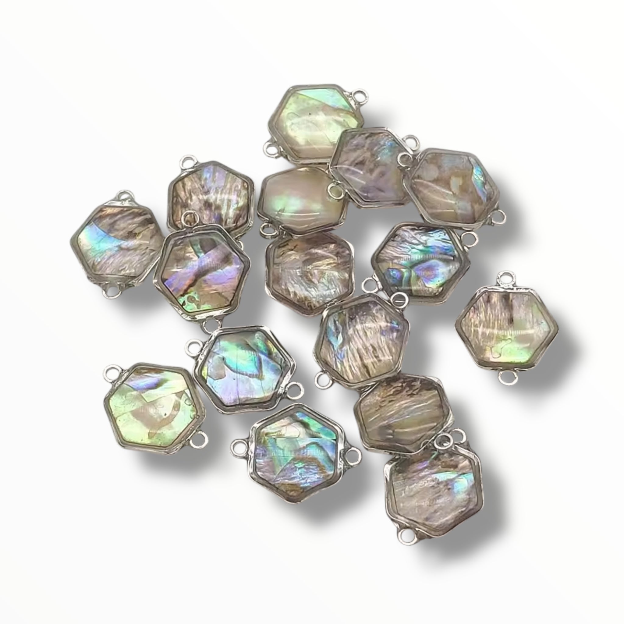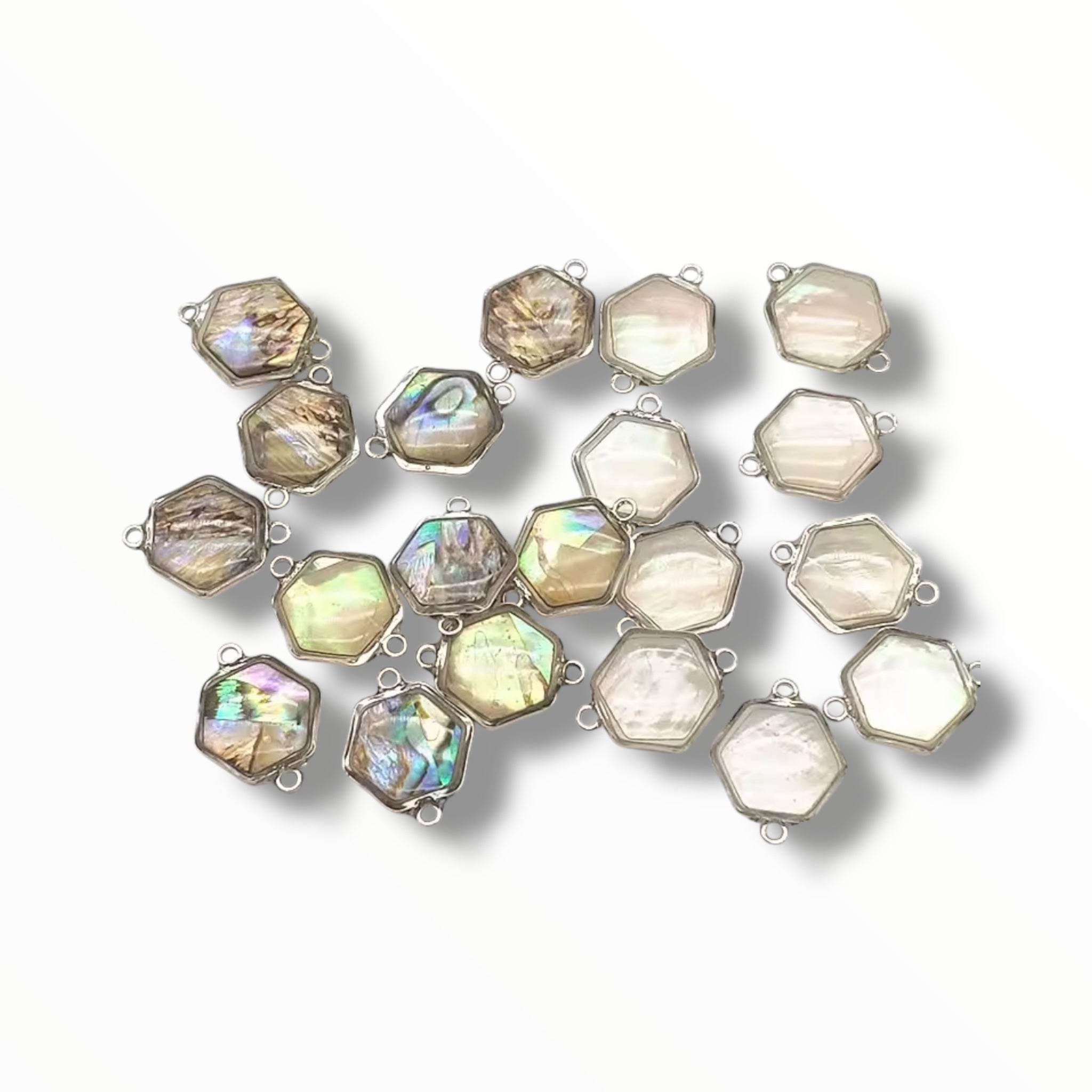 Add a touch of ocean-inspired elegance to your jewelry designs with these Real Shell Hexagon Connectors. Featuring a blend of abalone and white shell inlays, each piece shimmers naturally with iridescent tones. The rhodium finish offers a sleek, modern look that pairs beautifully with both cool and warm color palettes. Perfect for creating necklaces, bracelets, or earrings.