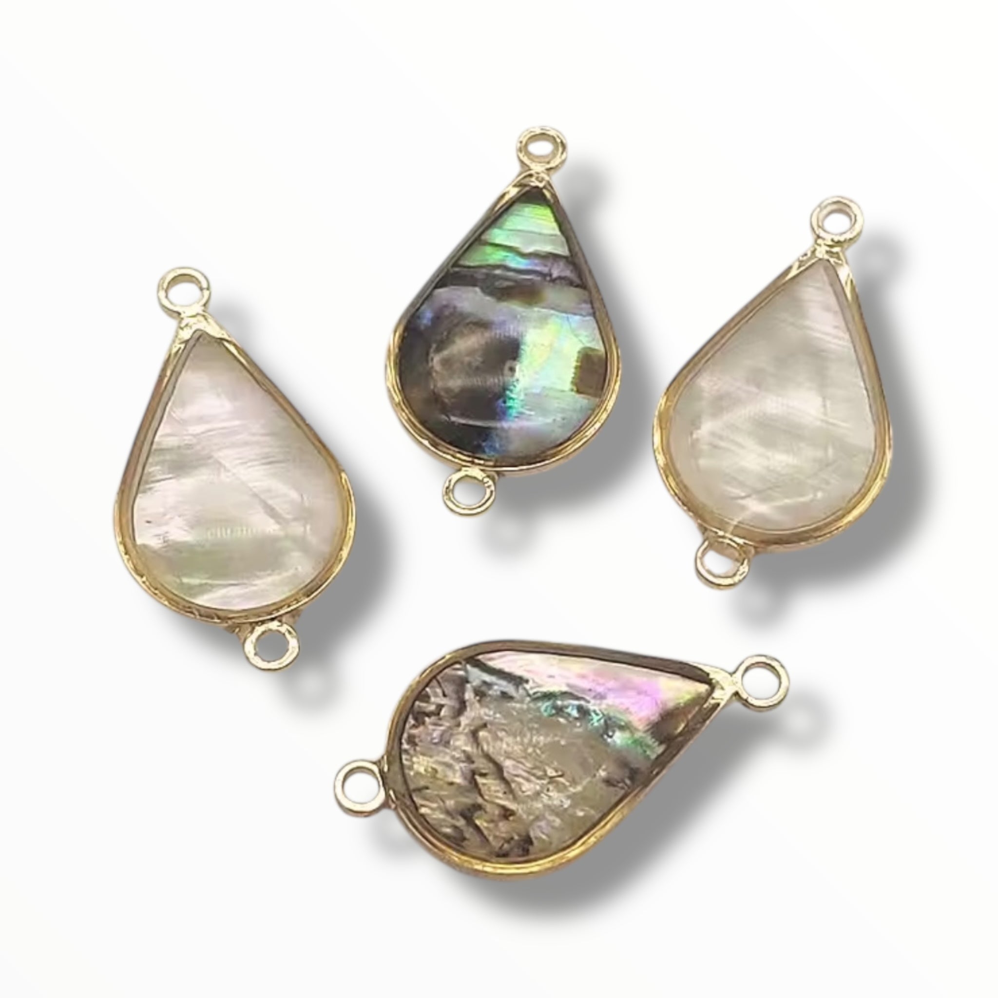 Add a touch of natural elegance to your jewelry creations with this Shell Drop Connector featuring abalone and white shell inlays framed in KC gold-finished copper. Each piece showcases unique shell patterns with iridescent tones, making it a stunning focal point for earrings, bracelets, or necklaces.