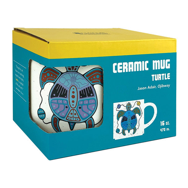 Start your day with inspiration using the Turtle Ceramic Mug, featuring the authentic artwork of Jason Adair, an Ojibway artist. With a generous 16oz capacity, this mug is perfect for your morning coffee, afternoon tea, or evening cocoa.