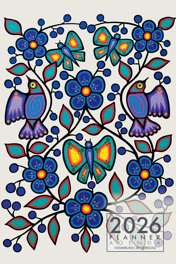Stay organized in style with the White Floral Garden 2026 Weekly Planner, featuring the vibrant artwork of Jim Oskineegish, an Ojibway artist. This beautifully designed 12-month planner includes 2026–2027 calendars, 128 full-colour pages, and 6 full-page images showcasing the artist’s original work, bringing colour and inspiration to your planning.